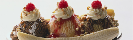 (Sorvete de morango, coco e abacaxi, chantily, cobertura de morango, abacaxi e cereja)
